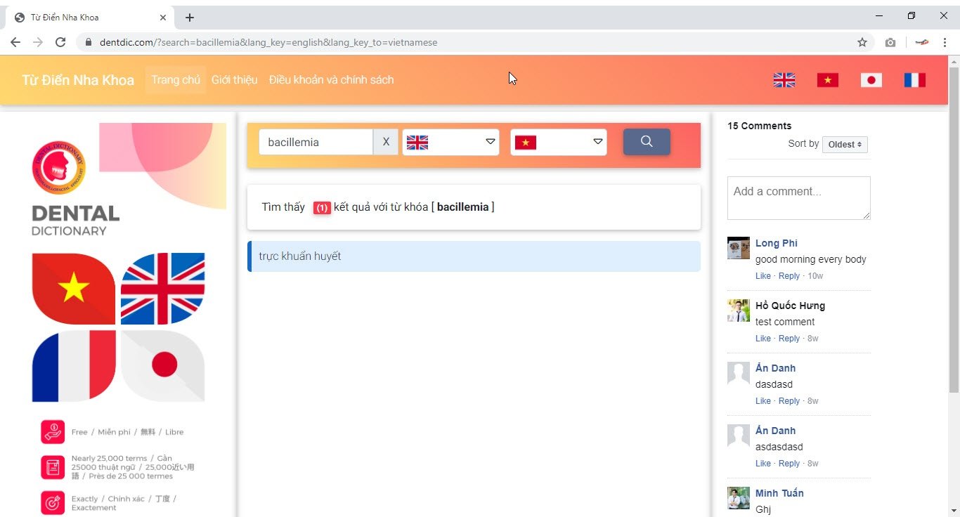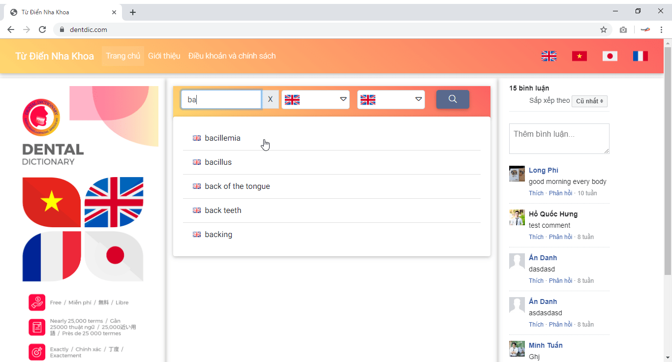 Nếu chỉ đọc tiêu đề phía trên, các bạn sẽ nghĩ từ điển Dentdic chỉ hoạt động được trên 2 nền tảng Android và IOS nhưng không chỉ có vậy, Dentdic còn có thể tra cứu từ trình duyệt của website bằng cách gõ: https://dentdic.com trên PC hoặc thiết bị di động của bạn. Giao diện của từ điển nha khoa này trên website được thiết kế tối giản, trực quan và dễ sử dụng với người dùng. Khi vào trang chủ từ điển, bạn sẽ thấy phía trên cùng là thanh menu gồm các danh mục nằm bên trái và bên phải là các biểu tượng cờ quốc gia giúp người dùng chuyển đổi ngôn ngữ website sang 4 thứ tiếng khác nhau (Tiếng Anh, Tiếng Việt, Tiếng Nhật và Tiếng Pháp). Phần chính phía dưới được chia làm 3 cột, bên trái là logo và biểu tượng của Dentdic, bên phải là phần comment dành cho người dùng được tích hợp với comment của facebook và ở giữa là phần quan trọng nhất: module tra cứu dịch thuật được bố trí cực kỳ đơn giản và thân thiện với người sử dụng, với 1 ô textbox để nhập từ, hai dropdown list để chọn ngôn ngữ nguồn và ngôn ngữ đích, và một nút tìm kiếm. Bạn chỉ cần gõ vào ô textbox 2 kí tự bất kì, lập tức hệ thống sẽ gợi ý cho bạn các thuật ngữ có trong cơ sở dữ liệu được bắt đầu bằng 2 kí tự đó. Tốc độ dịch thuật là rất nhanh, gần như là ngay tức thì và hầu như bạn không cần phải chờ đợi.
