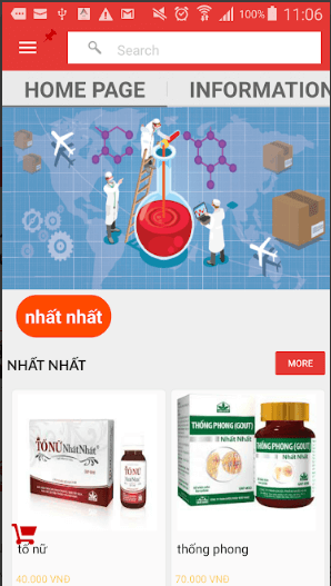 Khi vừa truy cập ứng dụng (app) bán hàng dược phẩm, người dùng sẽ được thấy banner, trang chủ, cũng như các danh mục sản phẩm ở giao diện chính. Thietke24h.com đã lắp đặt, thiết kế banner cho Nhất Nhất rất nổi bật và đẹp mắt, hình ảnh cực kì phù hợp với mô hình doanh nghiệp mà Nhất Nhất đang hoạt động. Ngoài ra, banner còn có thể chèn những thông tin, những chương trình khuyến mãi mà công ty muốn gửi tới khách hàng. Tùy theo lựa chọn, đội ngũ thietke24h.com sẽ thiết kế ứng dụng điện thoại theo ý thích của họ.